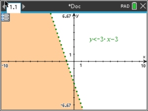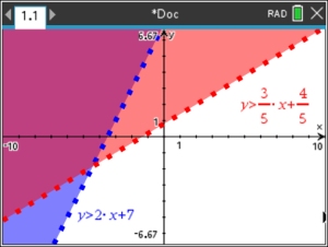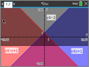 NOTE: If you previously used a TI-84+ CE graphing calculator, you know that it had a special feature that could shade only the solution area for a system of inequalities. It was listed under the title "Inequal Intersection". Unfortunately, the TI-Nspire CX II non-CAS does not offer such a build-in "intersection" feature. But, fortunately, the system graphs clearly show the intersection area.