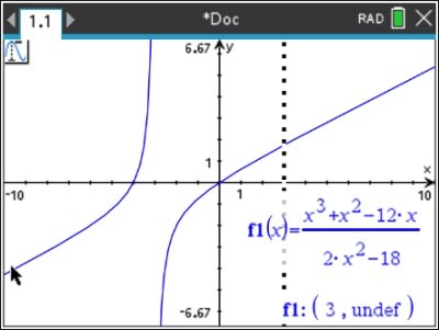 Using a TRACE on the graph, will show that the function is undefined at x = 3.